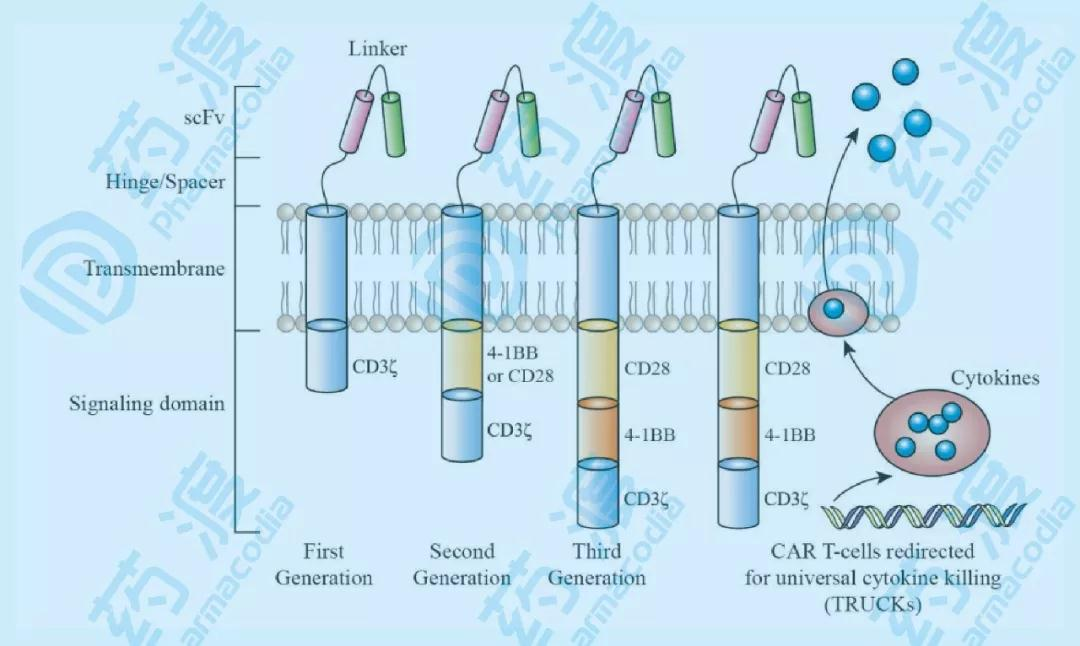 在第一代的基礎(chǔ)上,科學(xué)家增加了一個(gè)共刺激受體結(jié)構(gòu)域(包括CD28、 4-1BB、 DAP10等),在使用小鼠或人T細(xì)胞的幾種模型中可以觀察到具有雙信號(hào)傳導(dǎo)受體Car-T細(xì)胞的活性優(yōu)于僅活化受體Car-T細(xì)胞的活性;2002年,基于CD28的第二代Car-T細(xì)胞出現(xiàn);在2003年,科學(xué)家驗(yàn)證了CD19是優(yōu)秀的CAR靶點(diǎn),2004年,基于4-1BB的Car-T細(xì)胞被發(fā)展出來(lái) 。第三代Car-T細(xì)胞則是增加了多個(gè)共刺激受體結(jié)構(gòu)域,進(jìn)一步增強(qiáng)了Car-T細(xì)胞的活性。
