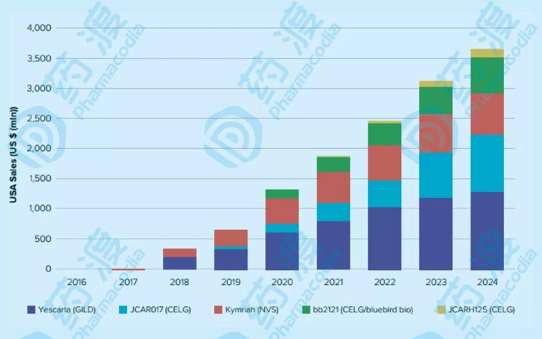 未來(lái)5年美國(guó)Car-T細(xì)胞產(chǎn)品銷售額(來(lái)源:Evaluate pharma)