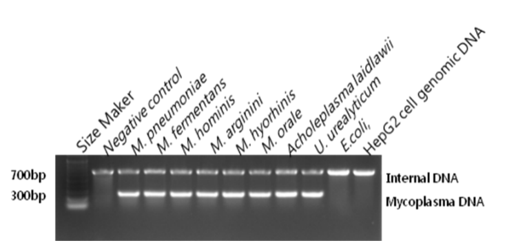 本試劑盒的引物序列特異性地針對支原體基因組中高度保守的的16S rRNA編碼區(qū),可檢測包括六種細胞污染常見的支原體在內的全部種屬的支原體,真核生物和細菌的DNA都不會被本試劑盒擴增。