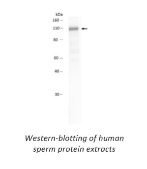This antibody is determined by its ability to recognise the C-terminus human AKAP4 protein. The monoclonal antibody (clone 7E10) recognizes both the pro-form of AKAP4 (110 kDa / 854 AA) and the AKAP4 (82 kDa / 665 AA) but does not react with the prodomain (21 kDa). It reacts also with AKAP4 proteins from horse, bull, mouse, rat and ram semens.Human AKAP4 (A-Kinase Anchor Protein 4) protein is encoded by a single gene located on chromosome X. The proAKAP4 polypeptide is converted into mature AKAP4 by proteolytic cleavage of the amino-terminal prodomain made of 188 amino acids. AKAP4 and its precursor proAKAP4 are both major components of the pig, horse, bull, mouse, rat, ram, dog, rabbit and human sperm fibrous sheath of the sperm flagellum. AKAP4 protein belongs to the family of A-kinase anchor proteins (AKAPs) all sharing a common function of binding to the regulatory subunit of protein kinase A (PKA) and confining the PKA holoenzyme to discrete locations within the cell. AKAP4 is also named AKAP-4, AKAP82 (A-Kinase Anchor Protein 82 KDa), PRKA4 (Protein Kinase Anchoring Protein 4), HI, CT99 (Cancer/Testis Antigen 99), FSC1 (Fibrous sheath component 1) or P82. AKAP4 plays a major role in flagellum formation, sperm motility, capacitation and fecundation.