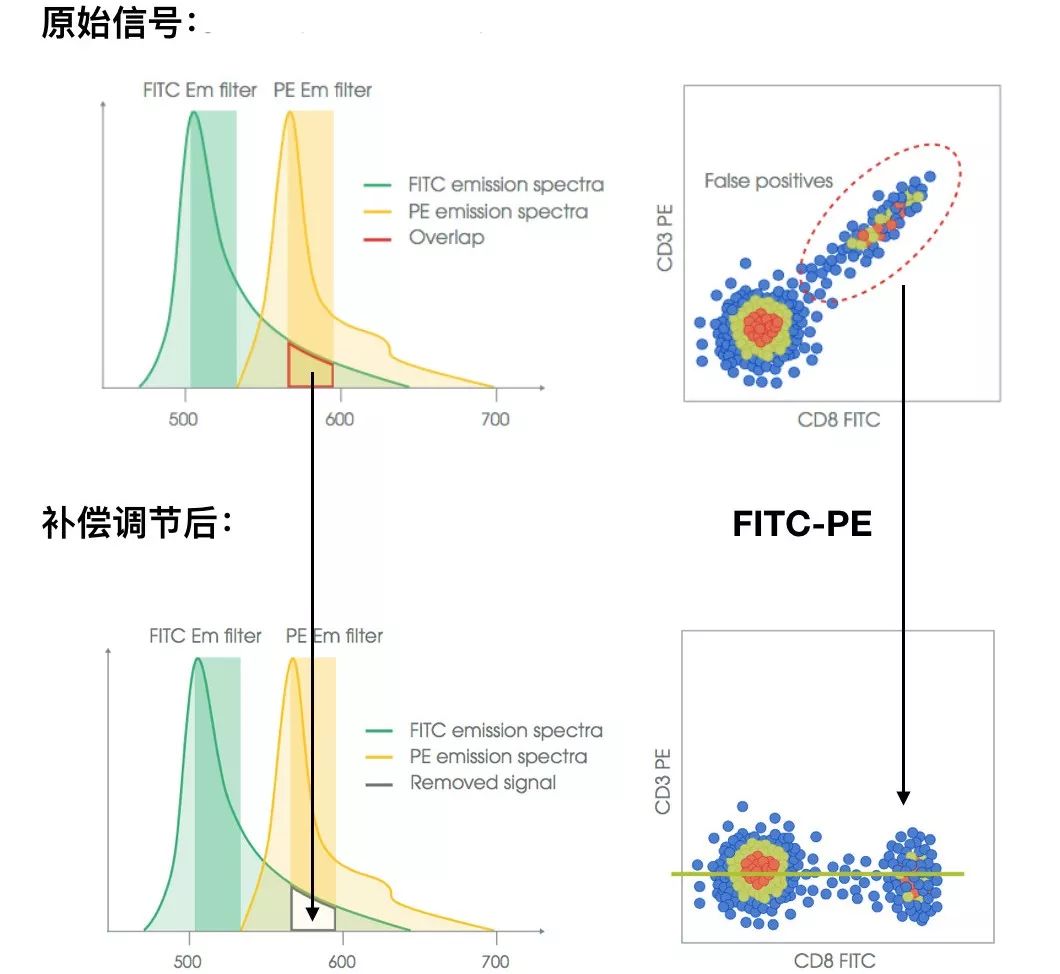 多色實驗時,要檢測某個熒光通道的表達情況,由于熒光滲漏影響占主要,所以檢測時先將該通道的抗體去掉,檢測一下其它通道漏到此通道的背景熒光水平,進行正確排除,從而幫助設門。