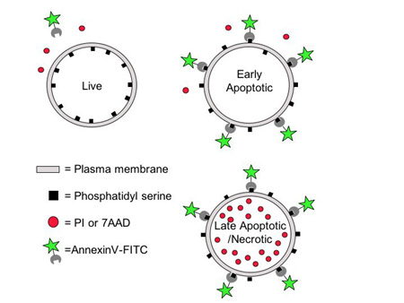 磷脂酰絲氨酸(Phosphatidylserine, PS)正常位于細(xì)胞膜內(nèi)側(cè),但在細(xì)胞凋亡早期,PS可從細(xì)胞膜內(nèi)側(cè)翻轉(zhuǎn)到細(xì)胞膜表面,暴露在細(xì)胞外環(huán)境中。磷脂酰絲氨酸的轉(zhuǎn)位發(fā)生在凋亡早期階段,先于細(xì)胞核的改變、DNA斷裂、細(xì)胞膜起泡。體內(nèi)的吞噬細(xì)胞可通過(guò)識(shí)別磷脂酰絲氨酸來(lái)清除凋亡細(xì)胞。Annexin-V是一種分子量為35~36KD的Ca2+依賴性磷脂結(jié)合蛋白,能與PS高親和力特異性結(jié)合,細(xì)胞處于調(diào)亡或壞死時(shí),Annexin-V可為陽(yáng)性(早期壞死細(xì)胞可能為陰性),是檢測(cè)細(xì)胞早期凋亡的靈敏指標(biāo)。將Annexin-V進(jìn)行熒光素(FITC、PE)標(biāo)記,利用流式細(xì)胞儀或熒光顯微鏡可檢測(cè)細(xì)胞凋亡的發(fā)生。碘化丙啶(propidine iodide, PI)是一種核酸染料,它不能透過(guò)完整的細(xì)胞膜,但在凋亡中晚期的細(xì)胞和死細(xì)胞,PI能夠透過(guò)細(xì)胞膜而使細(xì)胞核紅染。因此將Annexin-V與PI匹配使用,就可以將凋亡早晚期的細(xì)胞以及死細(xì)胞區(qū)分開來(lái)。