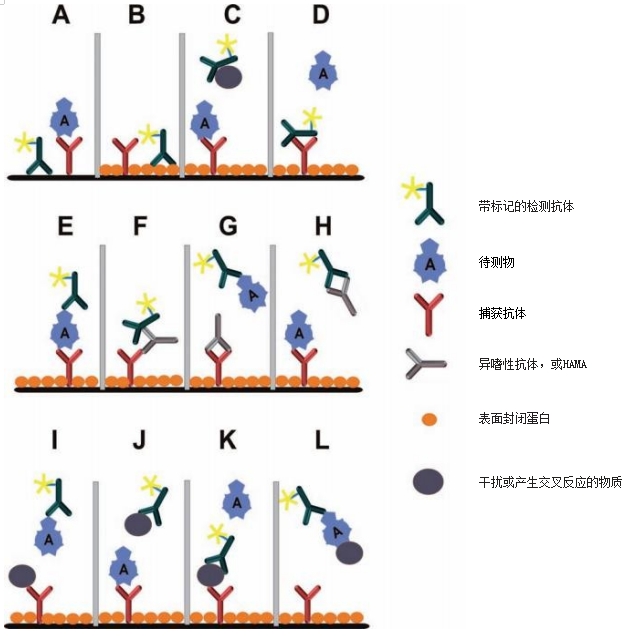 所有的免疫分析方法的特征是在目標(biāo)分析物和抗體之間的結(jié)合反應(yīng)。這些方法存在的問題是經(jīng)常發(fā)生的干擾,導(dǎo)致了錯誤的檢測,這個問題至今未得到充分地解決。典型的干擾有非特異性結(jié)合,導(dǎo)致較差的信噪比和高背景, 交叉反應(yīng)和基質(zhì)效應(yīng)。簡單地說,這些效應(yīng)大多是基于分析物、捕獲抗體或檢測抗體與外部物質(zhì)或表面的直接相互作用。圖1表示了一種典型干擾效應(yīng)的簡化方案。在技術(shù)文獻(xiàn)中經(jīng)常被描述的已知的干擾因素有如異嗜性抗體和HAMAs(人抗小鼠抗體)、類風(fēng)濕性因子、白蛋白、補(bǔ)體,溶菌酶以及其他等。