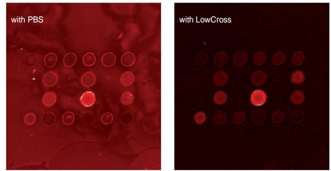 圖2到圖5顯示使用LowCross Buffer®可防止免疫分析中典型的干擾效應(yīng)的不同示例。圖2顯示了在蛋白芯片應(yīng)用中使用LowCross Buffer®可降低高背景,并將信噪比從3.4提高到17.3。在這個實驗中,對不同多克隆抗EPIL抗體(EPIL=早期胎盤胰島素樣生長因子) 的適用性進(jìn)行了測試。抗體使用濃度為500µg/ml、體積為1.8 nl/spot通過生物芯片打點機(jī)(GMS 417)固定在氨基硅烷化的微陣列載玻片上。隨后,將2ml的EPIL過度表達(dá)細(xì)胞系(SKBR3) 培養(yǎng)基與染料Oyster650P混合,此時培養(yǎng)基內(nèi)蛋白質(zhì)被標(biāo)記。分別使用LowCross Buffer®和PBS按照1:20稀釋培養(yǎng)基,加在載玻片上進(jìn)行孵育。沖洗載玻片后,用熒光掃描儀(GMS 418) 進(jìn)行讀取,并用ImaGene分析數(shù)據(jù)。通過使用LowCross Buffer®可以明顯降低背景信號,從而使得更好地區(qū)分單個抗體是否適用于檢測EPIL。