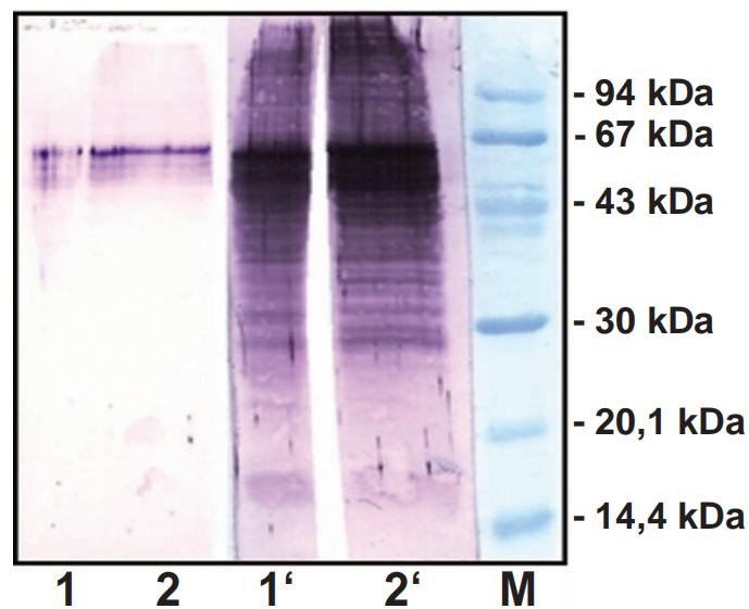 圖3: Western blotting法檢測細(xì)胞角蛋白4、5和6。圖中顯示了實驗中使用LowCross Buffer®和TTBS檢測的效果對比。LowCross Buffer® 可以完全防止不必要的結(jié)合。細(xì)胞角蛋白4、5和6在56-60kDa之間,使用LowCross Buffer® 可清晰地被檢測到。泳道1和1'樣本來自肝細(xì)胞,泳道2和2'樣本來自Hela細(xì)胞。M為分子量marker,用酰胺黑染色。印跡膜是硝酸纖維素膜porablot NCP。