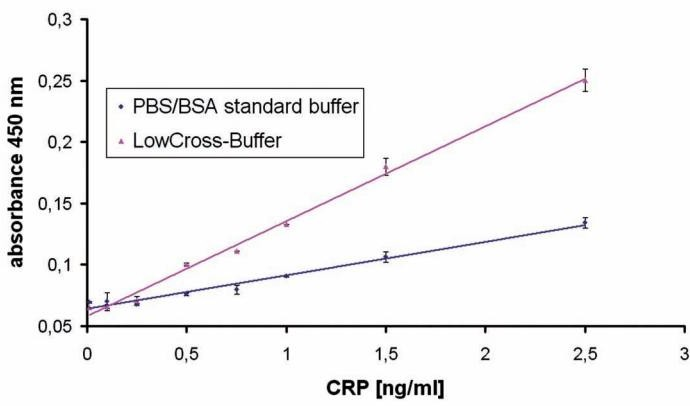 圖4:ELISA法檢測家兔血清中的CRP。 LowCross-Buffer®通過去除基質(zhì)效應(yīng)來提高靈敏度。