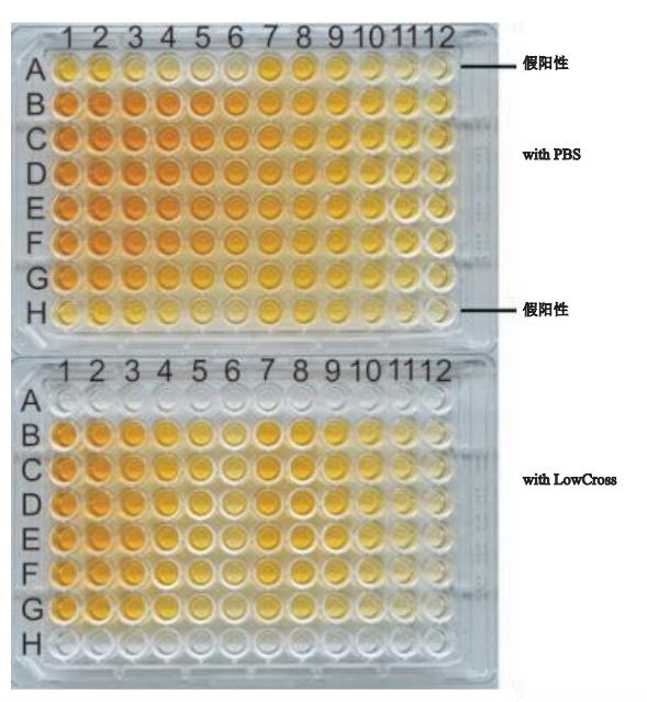 圖5: 在用豚鼠IgG進(jìn)行ELISA實驗中,通過使用LowCross-Buffer®防止假陽性結(jié)合(A1- 12行為對照組,H1-12為空白組)。